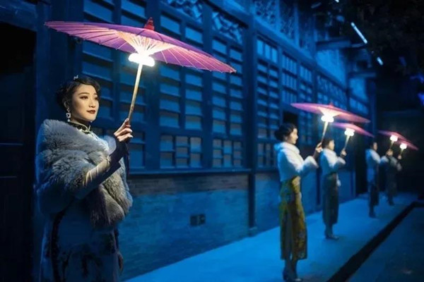 到了晚上,这里的杨孟高、刘元琥、刘元瑄、陈月生4座老公馆被整体打造成了大型公馆实境体验剧剧院,联袂上演了一出以“民国安仁”为样本的“西南外滩”传奇故事——《今时今日安仁》。