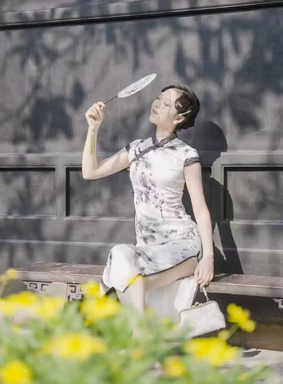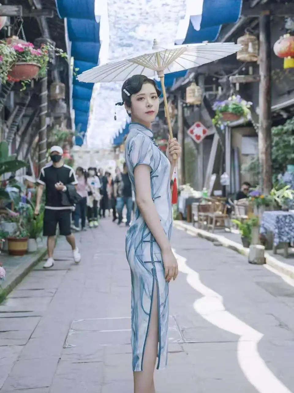 穿上旗袍,走在老街上,无论是浅笑回眸,还是手握小扇的静谧侧影,都能捕捉到温暖而宁静的光影感。