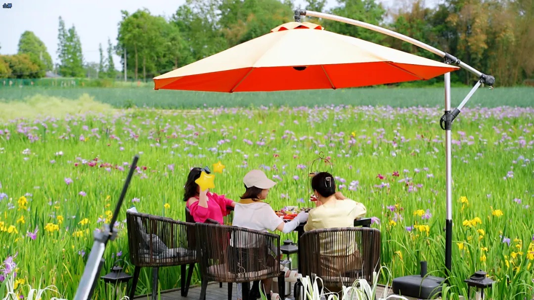 走出古镇核心区,南岸美村是另一番开阔的田园景象,紫鸢尾、稻田铺满田野。