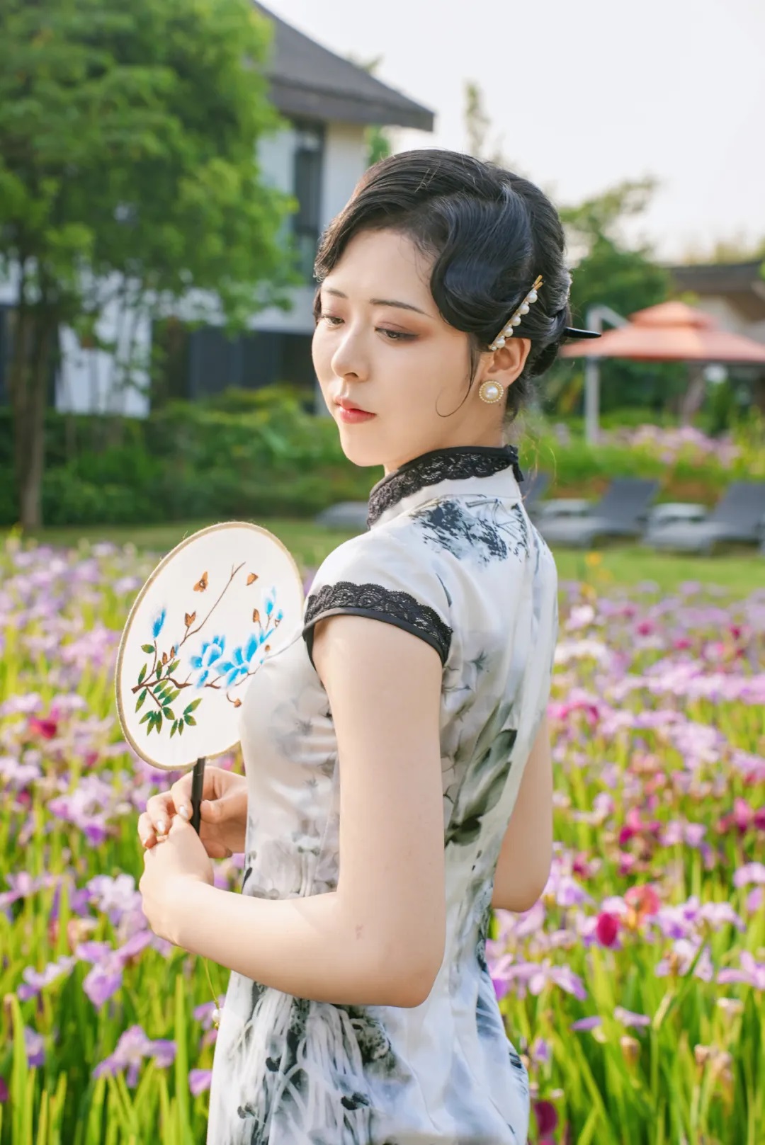 选择清雅或田园风旗袍,漫步田园小径,以花圃或特色民宿为背景,画面清新优雅。