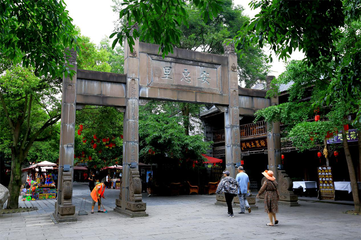 安惠里建造在老公馆与新公馆相通的道路上。青灰中而略微透出黑黄色的一楼一底木结构中式房舍,浑然一体中夹杂着些许看似无意其实颇讲究的高低错落变化。一条小河穿街而过,河道两旁或绿叶婆娑,或怪石斜卧。麻灰色的长方形石板街径,造型古朴典雅的仿古石桥,九曲连巩固的石护栏,在茵茵碧绿草坪和淙淙流淌的溪水陪衬下越发显得古韵浓浓。红红的灯笼,猎猎的店招在一间连着一间的古玩店、老茶坊的屋檐下随风飘荡,隐约着,不知谁的风铃儿还荡起了悦耳的响声……站在小石桥边凭栏张望,近处是看店的老婆婆坐在有些年辰的竹椅上,戴着老光眼镜纳着鞋底;几位须发皆白的“老把子”围着一张黑黢黢的小方桌边吹闲龙门阵边品清茶;一位扎着独辫穿着蓝底白花中式衣服的幺妹靠在门框上向远处的高大牌坊上眺望,一只小花狗懒洋洋地趴在她的脚下睡觉。稍远一些的地方,几位金发高鼻的外国背包族正站在“吴记玉器铺”门前,聚精会神地听着老板介绍某件古代玉器的来历……