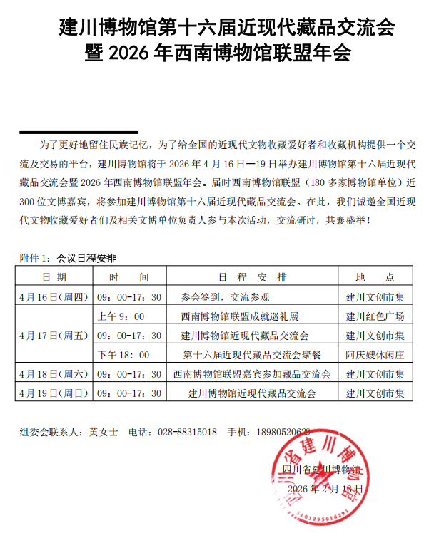 为了更好地留住民族记忆,为了给全国的近现代文物收藏爱好者和收藏机构提供一个交流及交易的平台,建川博物馆将于2026年4月16日—19日举办建川博物馆第十六届近现代藏品交流会暨2026年西南博物馆联盟年会。届时西南博物馆联盟(180多家博物馆单位)近300位文博嘉宾,将参加建川博物馆第十六届近现代藏品交流会。在此,我们诚邀全国近现代文物收藏爱好者们及相关文博单位负责人参与本次活动,交流研讨,共襄盛举!