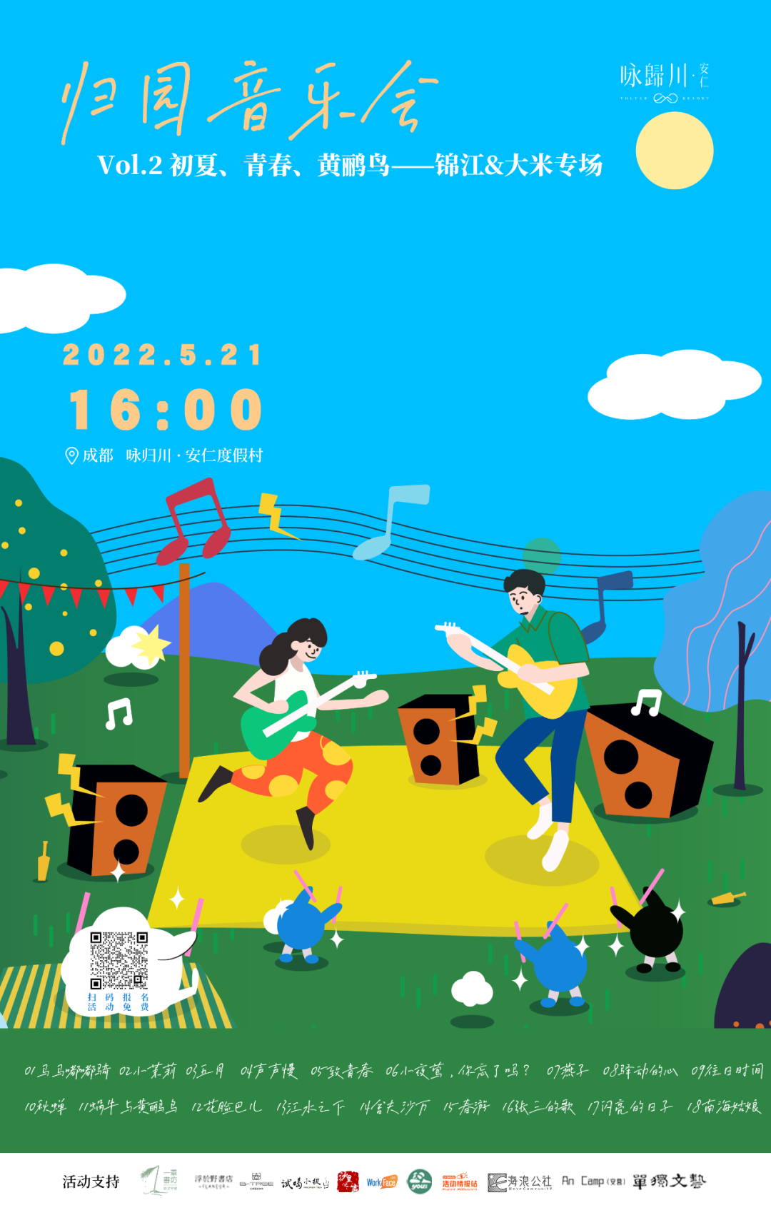 “初夏、青春、黄鹂鸟”是归园音乐会第二场的主题,来自成都的良人组合锦江&大米将在初夏的乡野,歌唱五月,歌唱知了、池塘、蜗牛、黄鹂鸟,歌唱自然万物。通过歌声,将每一天塑造成闪亮而青春的模样。