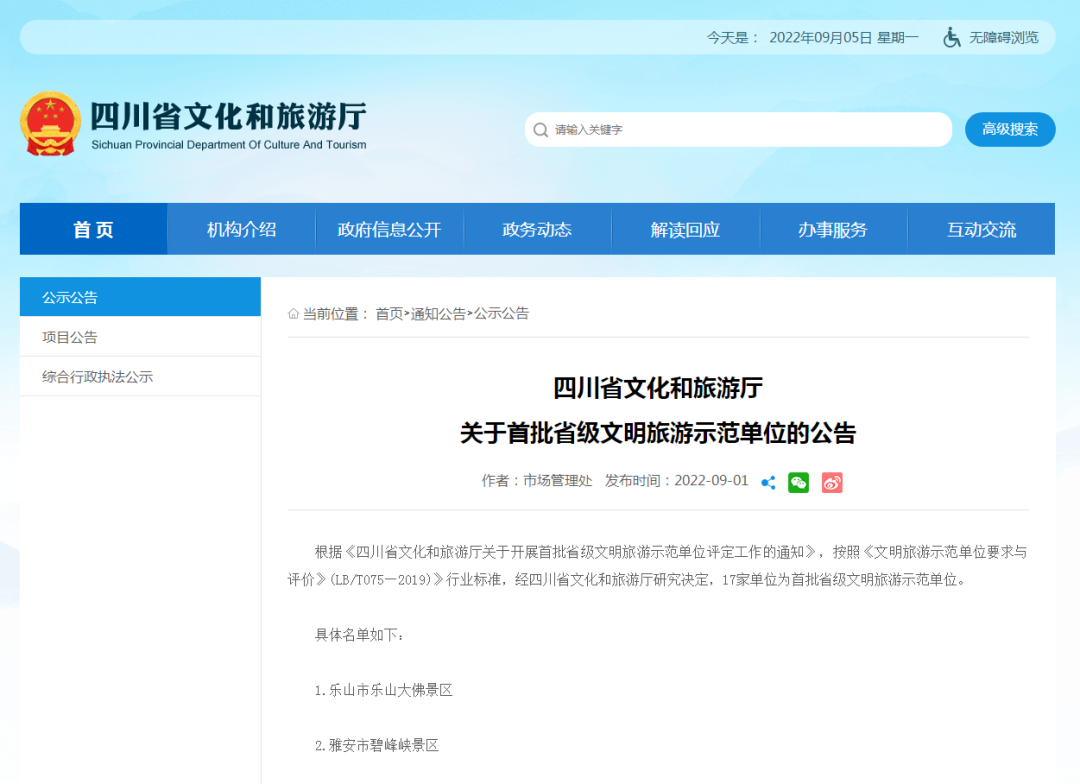 9月1日,四川省文化和旅游厅发布关于首批省级文明旅游示范单位的公告,成都、德阳、眉山三城共有6家单位获批↓↓↓