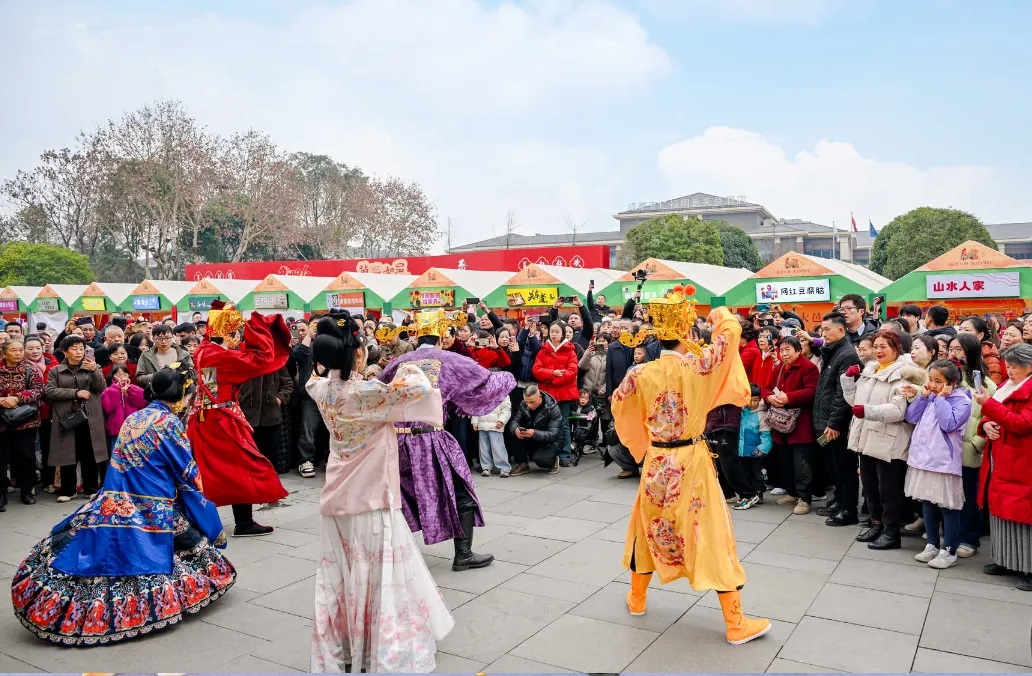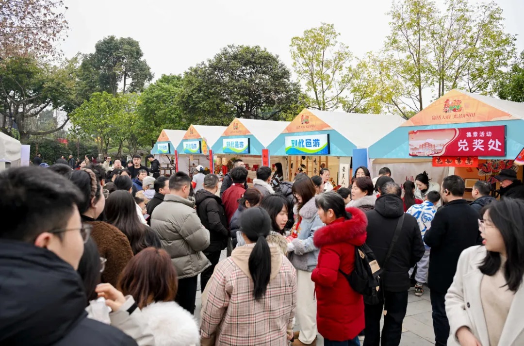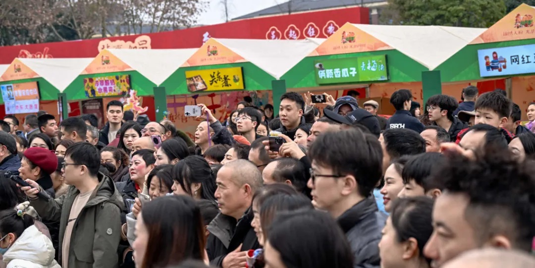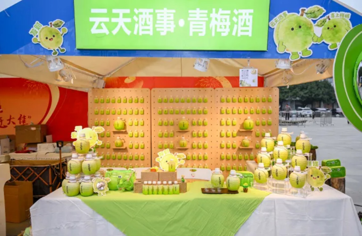 本土美食摊位前围满了品尝的游客,年货摊前,游客们挑选着心仪的年货,满载而归。“云天酒事”摊位前,梅子酒的香气吸引了不少人驻足品尝,为新春增添了几分微醺的惬意。