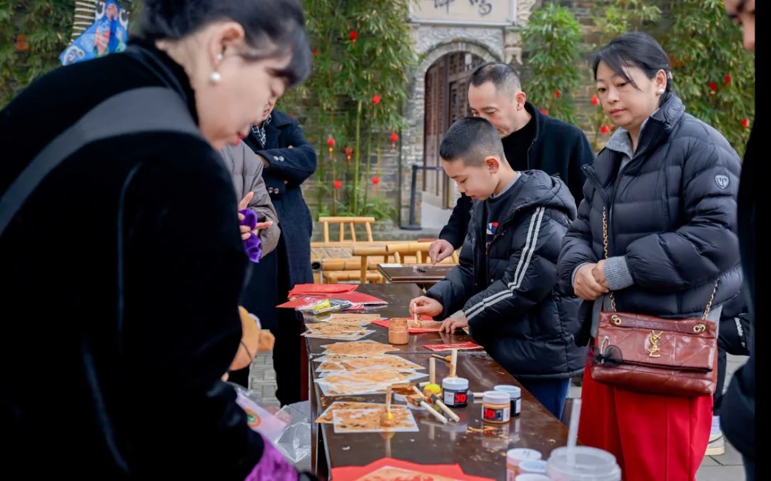 华公馆里,亲子手作体验吸引了不少家庭参与。拓福、绘纸鸢、彩绘福柚、非遗鱼灯DIY——每个手作桌前都有小朋友正在体验。