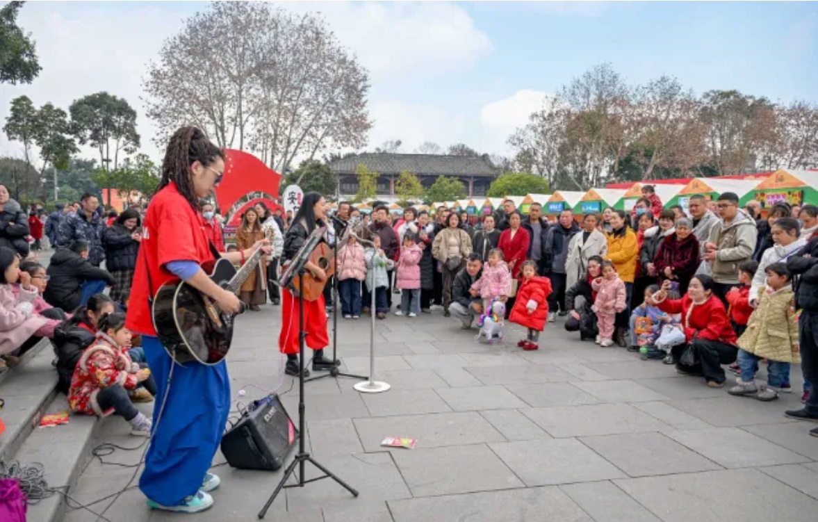下午3点,安仁塔下,“柚福新春·邑路欢歌”乐队演出准时开始。动感的旋律吸引了不少游客驻足聆听。“点歌传福”互动环节,观众写下心愿投入“点歌柚”,乐队随机抽取演奏,将音乐的祝福送给现场的朋友们。