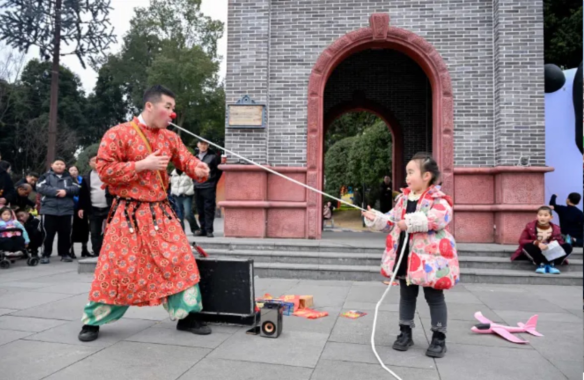 下午4点,安仁奇幻剧场的古彩戏法互动演出准时开场。精彩戏法引得围观游客阵阵惊呼。小朋友们伸长脖子想要看清其中奥秘,大人们也纷纷举起手机记录这神奇的瞬间。