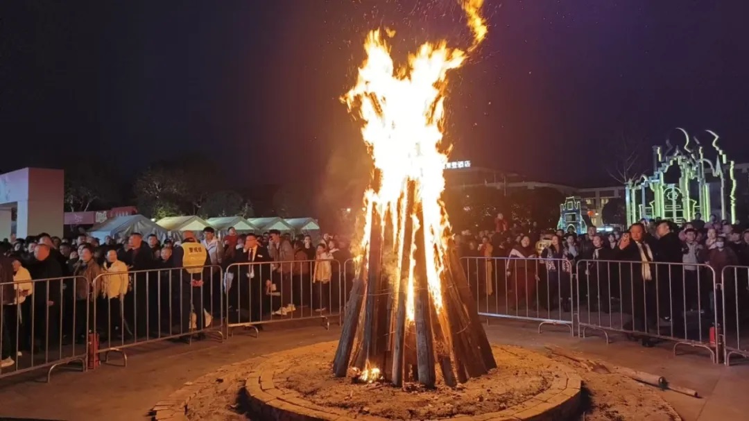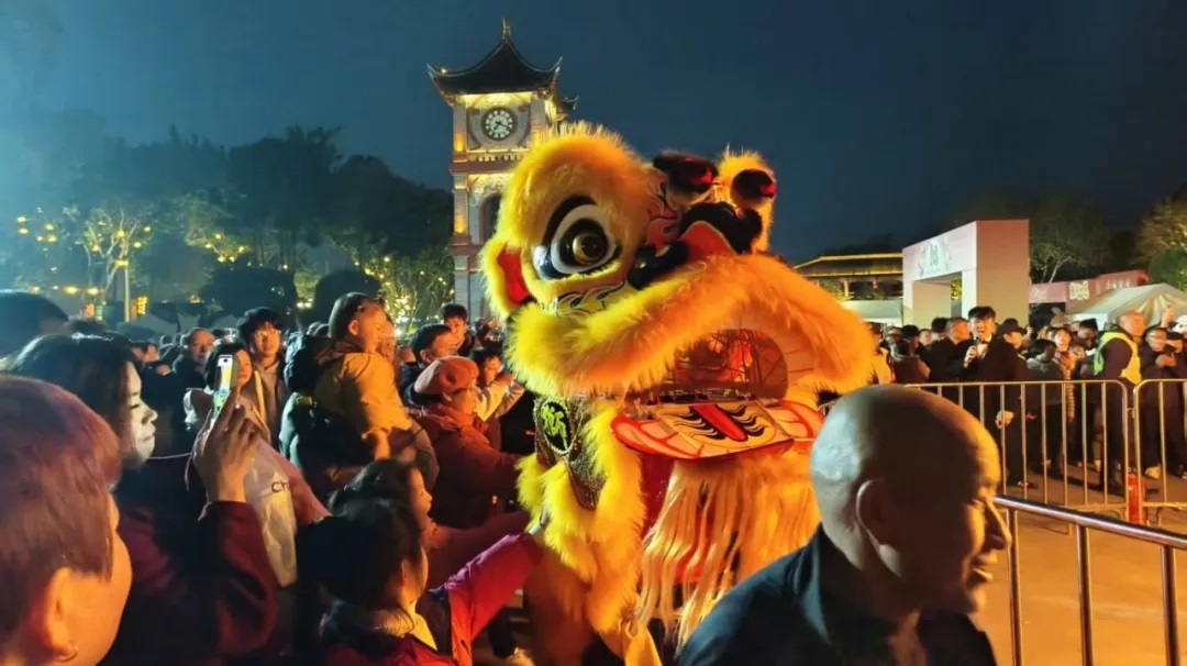 晚上7点,安仁坝子广场,金狮贺岁·篝火狂欢准时开场。舞狮绕火腾跃,精彩表演引发现场阵阵喝彩。篝火点燃后,游客们自发围成一圈,牵手共舞,欢笑声在夜空中回荡,寒冷的冬夜被热情点燃。
